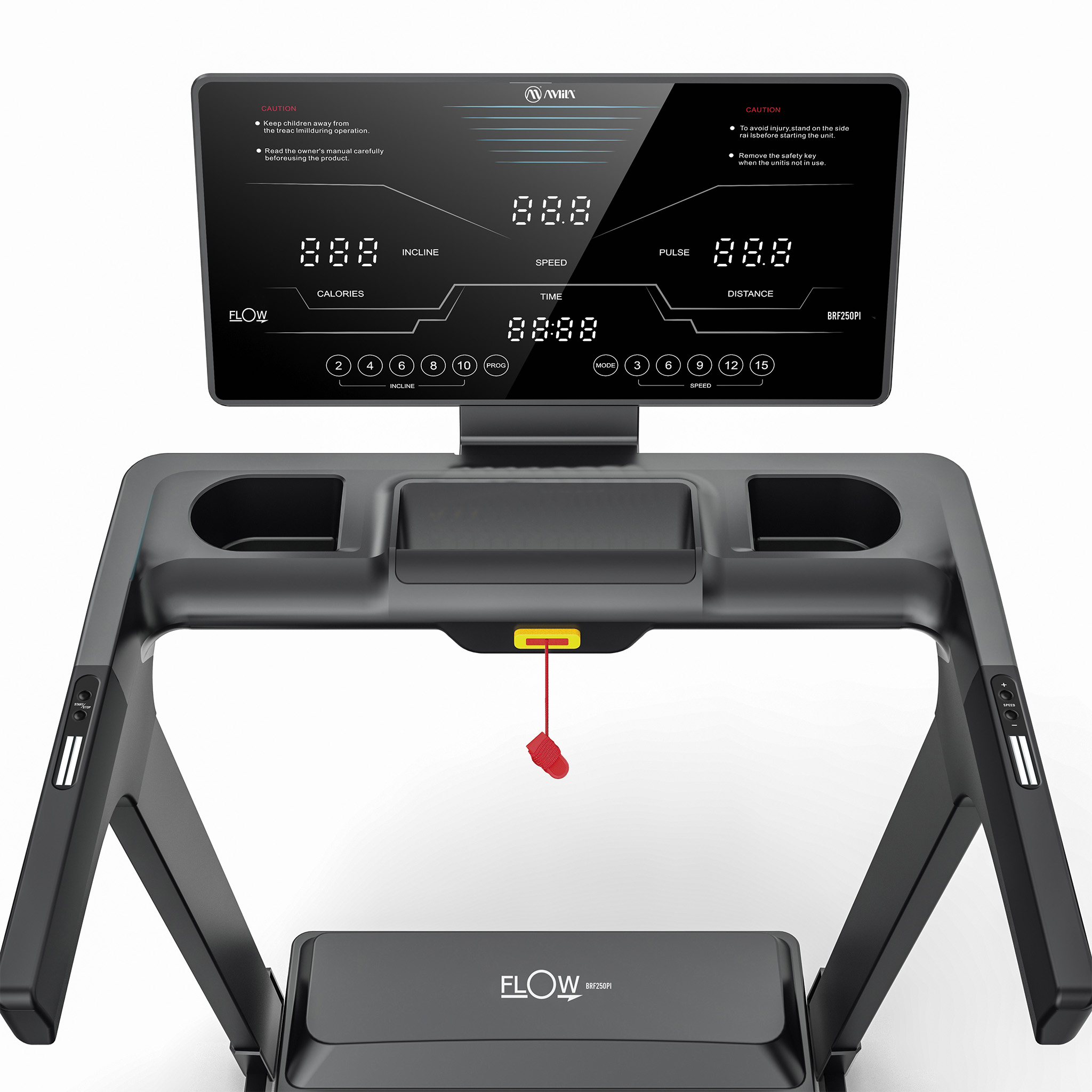 Η κονσόλα του Flow F250PI σας προσφέρει απόλυτο έλεγχο πάνω στο διάδρομό σας! Διαθέτει 4 ευανάγνωστα και φωτεινά παράθυρα LED, που θα σας δείχνουν συνεχώς όλες τις απαραίτητες πληροφορίες της άσκησής σας, όπως Ταχύτητα, Παλμούς, Χρόνο, Θερμίδες, Απόσταση και Κλίση. Μετρήστε το σωματικό σας λίπος εύκολα και γρήγορα και δείτε τα αποτελέσματα της άσκησής σας. Ρυθμίστε ταχύτητα και κλίση εύκολα με τα κουμπιά στις χειρολαβές. Μετρήστε το επίπεδο των καρδιακών σας παλμών με τους αισθητήρες αφής. Βρείτε το πρόγραμμα προπόνησης που σας αρέσει περισσότερο ανάμεσα σε ένα πλήθος 36 προκαθορισμένων προγραμμάτων ή φτιάξτε το δικό σας.